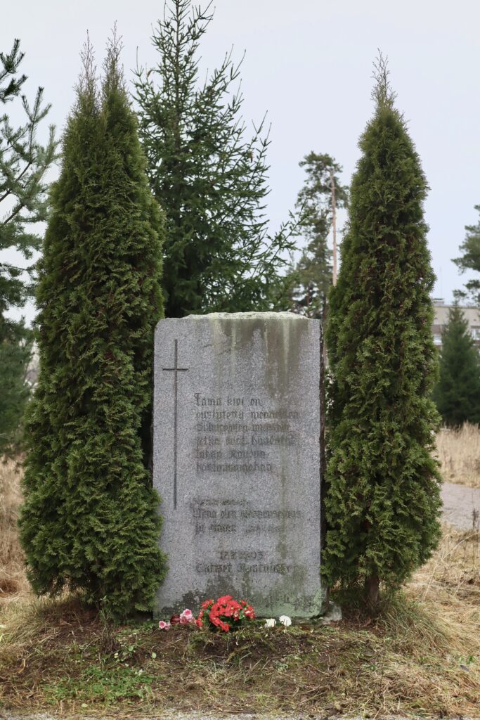 Kun sain heinät leikattua, keräsin ensin esiin tulleet roskat, tölkit, pullot ja jopa öljykanisterit ja vein ne lähistöllä olevaan roskasäiliöön. Heinät vedin kevytpeitteellä hautausmaa takaosan tunkiolle. Lopuksi laitoin tuomani kukat menneiden sukupolvien muistomerkille ja sankarihautausmaan muistomerkille, jossa pidin myös hiljaisen hetken.