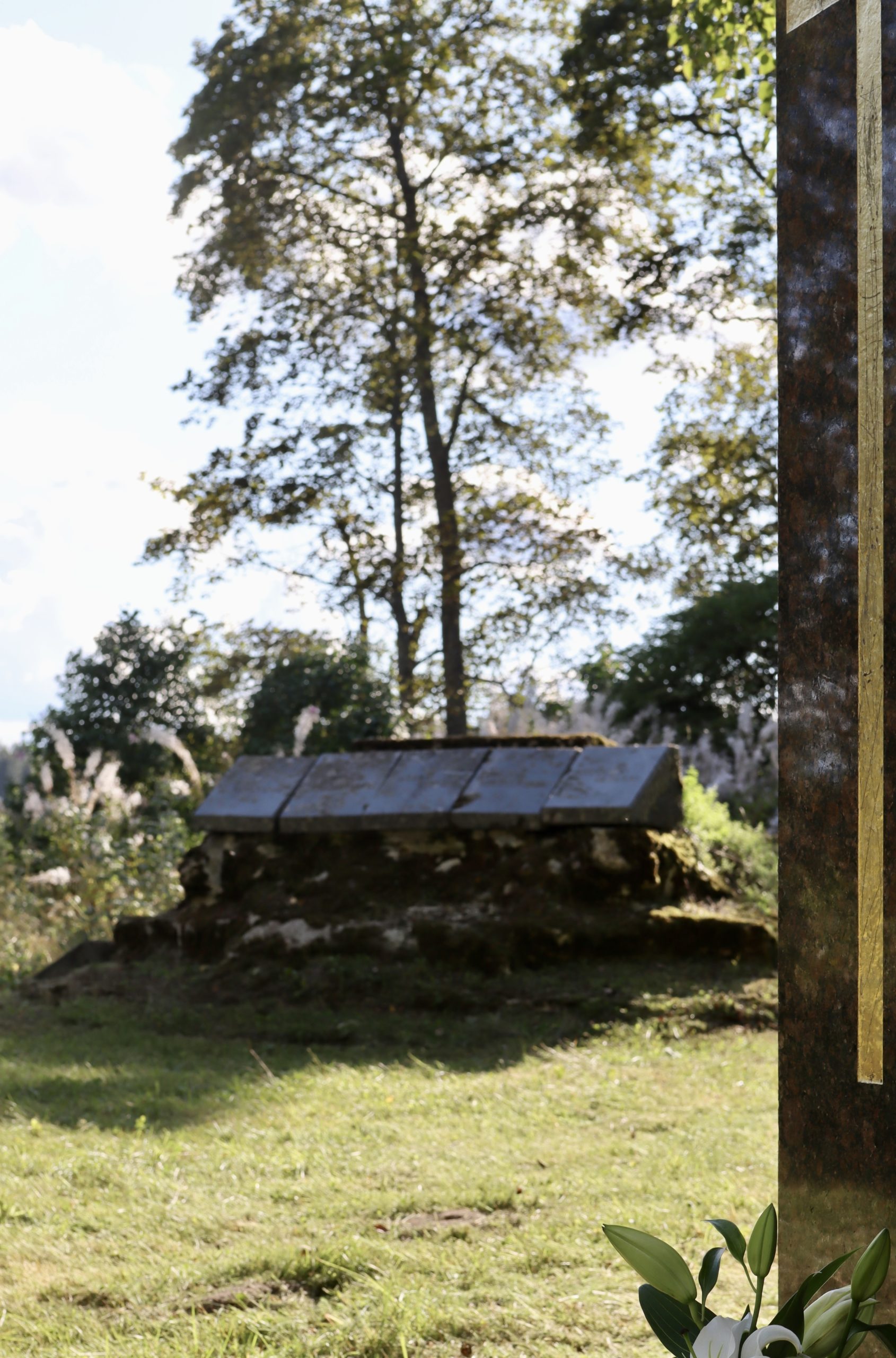Muistomerkin vasemmassa reunassa on iso kullan värinen risti ja muistomerkin yläosassa on teksti: ”Jääsken sankarihautausmaa / 1939-1940, 1941-1944” jonka alla on runo: