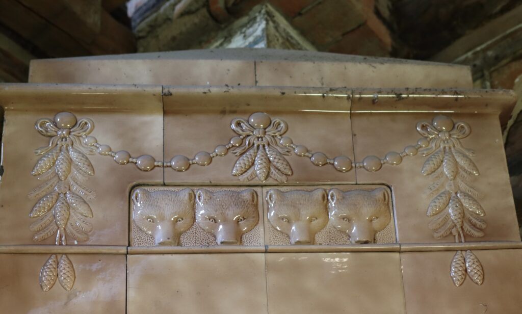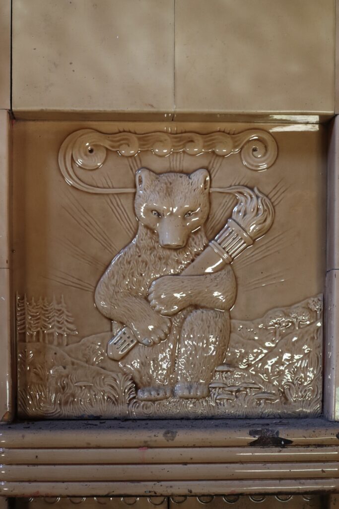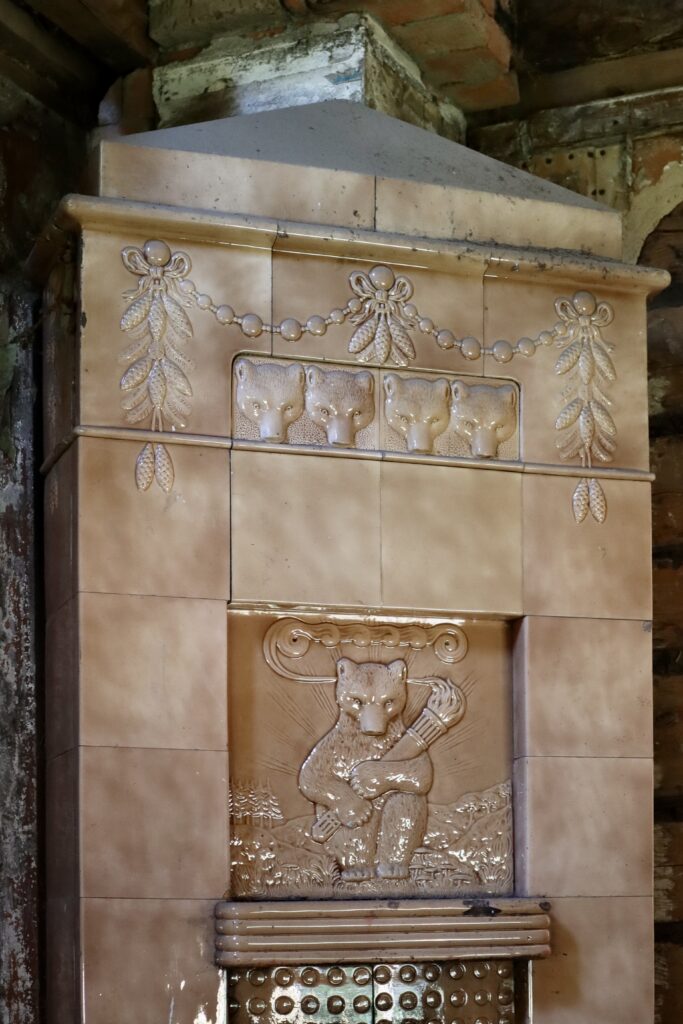 Nina uskaltautui myös katsomaa, kun talon isäntä näytti leppoisalle. Talon kohokohta oli Rakkolanjoen kaakelitehtaan valmistama kaakeliuuni ja ennenkaikkea karhu-uunin yksityiskohdat, vaikka siitä oli lohkeillut paloja.