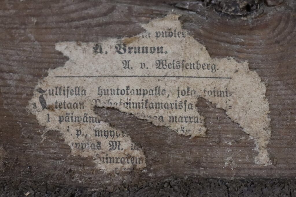 Isäntä oli tekemässä remonttia tuossa suomalaisten vuonna 1895 rakentamassa talossa, joten osa lattiasta oli poissa. Seinistä hän kertoi purkaneensa monta kerrosta ja vanhin kerros oli ollut suomenkielistä sanomalehteä, josta oli edelleen pieniä paloja näkyvillä seinissä.