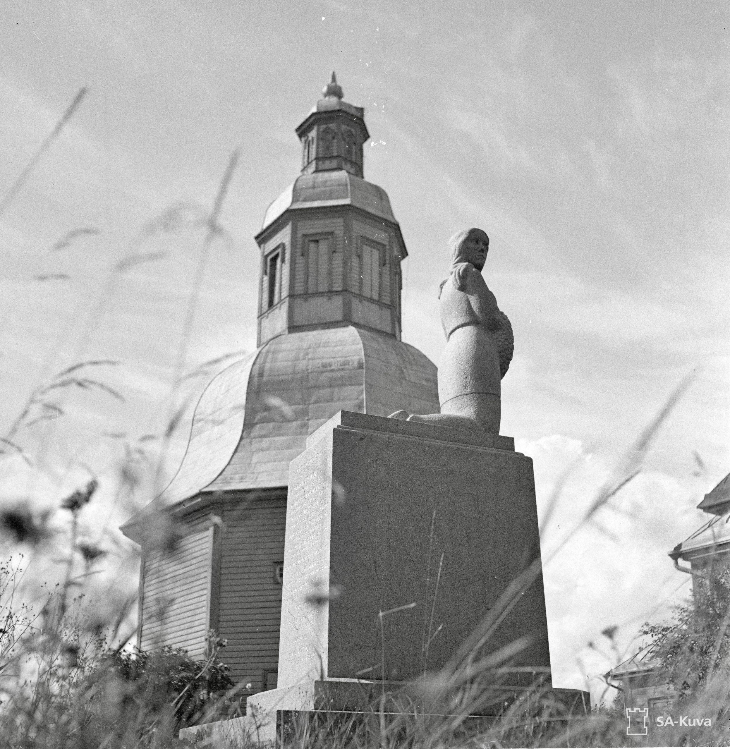 Kirvun sankaripatsas, taustalla Kirvun kirkon kellotapuli.