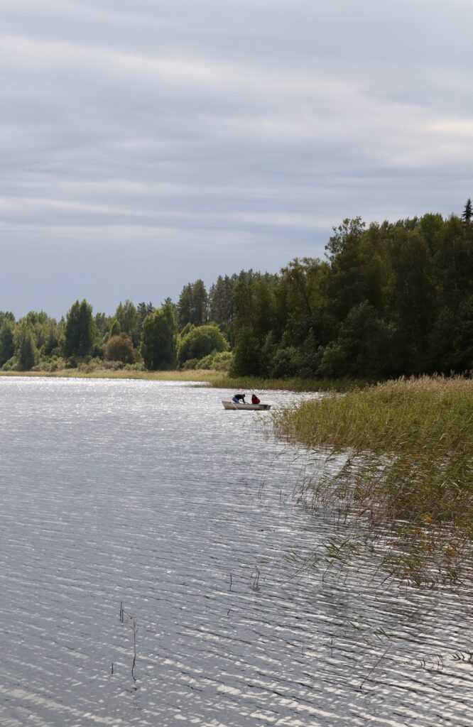 Ilma oli vähän pilvinen mutta niin lämmin, että pieni viima tuntui kivalle, kun veneellä yritimme Vuoksea. Matka meni tosi nopeasti ja pian olimme toisella rannalla. Ohjeistin miestä ajamaan veneen laiturin viereen ja kiinnittymään siihen. Nousimme venäläisen työkaverini Ninan kanssa laiturille ja lähdimme kohden sankarihautausmaata.