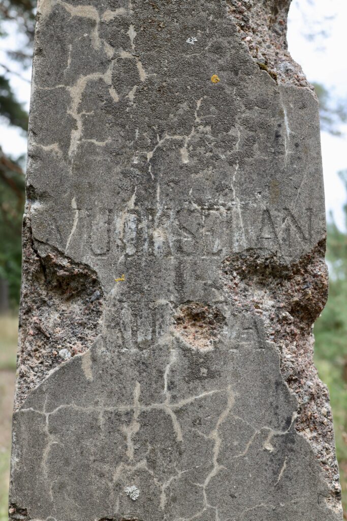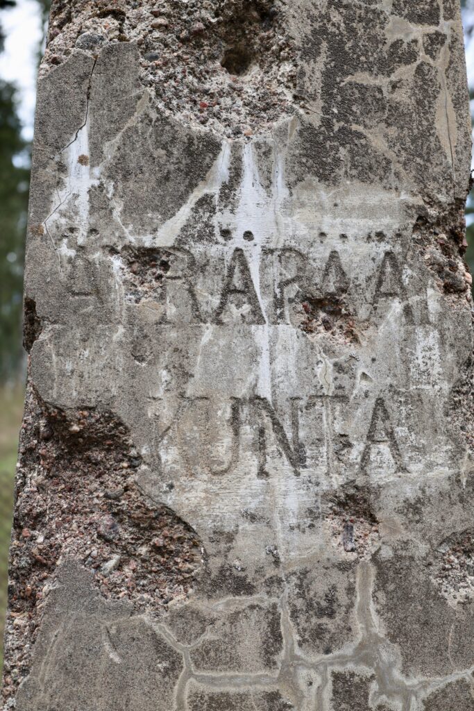 Kun olimme katsoneet sankarihautausmaan alueen, näytin Ninalle vanhan Vuokselan ja Äyräpään kuntien välisen rajapylvään. Otin rajapylväästä vain lähikuvat teksteistä mutta en koko pylväistä.